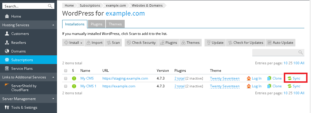 - Klicken Sie neben dem Namen der WordPress-Installation, die Sie synchronisieren möchten, auf die Schaltfläche "Synchronisieren".